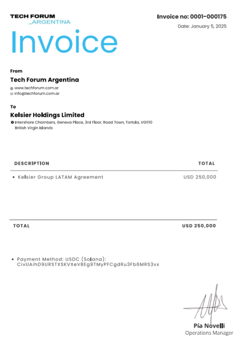 Pero el informe que Taiano conoce desde hace cuatro meses tenía algo más: una factura a Davis por USD 250 mil dólares firmada por la mismísima Pia Novelli, la hermana del empresario grabada junto a su madre vaciando cajas de seguridad del Banco Galicia pocos días después del estallido de $LIBRA. La factura está fechada el 5 de enero de 2025, tiene como causa el acuerdo ya mencionado entre los empresarios locales con los que Milei viene haciendo negocios y chateando al menos desde 2021 y establece el pago en una billetera virtual.