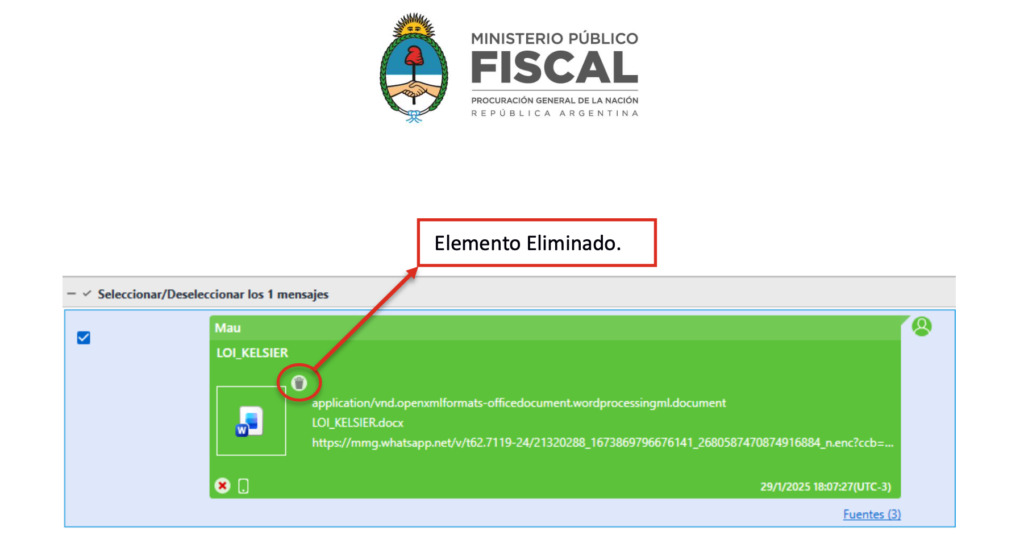 Se trata de un archivo en formato Word, denominado “LOI_KELSIER.docx”1 que Mauricio Novelli se envió a sí mismo por WhatsApp el 29 de enero de 2025 a las 18:07:27 (horas antes de la famosa visita de todo el grupete a Casa Rosada el día 30) y que luego eliminó, pese a lo cual los peritos de la Dirección General Investigaciones y Apoyo Tecnológico a la Investigación Penal (DATIP) del Ministerio Público Fiscal de la Nación pudieron recuperarlo.