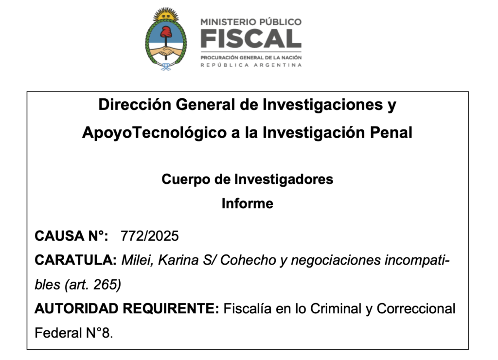 Se ve que Taiano no sabe que Karina Milei encabeza la carátula de la causa cuya investigación tiene el altísimo honor de conducir en los términos del art. 120 de la Constitución Nacional. “Milei, Karina s/cohecho y negociaciones incompatibles (art. 265)”. Así se caratula el expediente N°772/2025 conocido como $LIBRA, chicos.