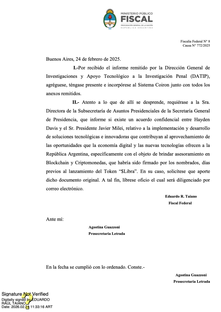 2 Me refiero, entre otras, a la nota del 22/12/25 titulada “Exclusivo: Hayden Davis, el impulsor de $LIBRA, tenía un acuerdo confidencial con Javier Milei” y a la del 30/01/26, “Escándalo cripto: el texto del acuerdo confidencial entre Hayden Davis y Javier Milei, firmado hace un año”.