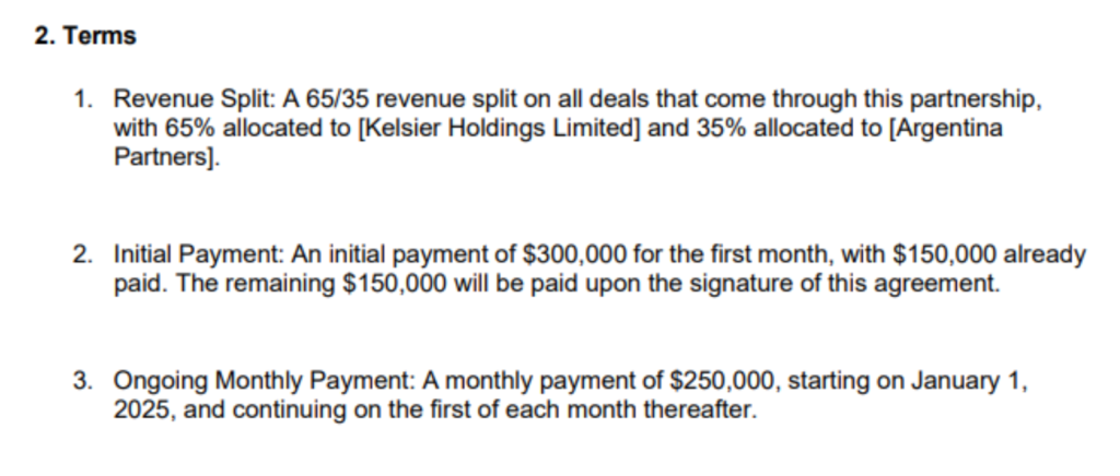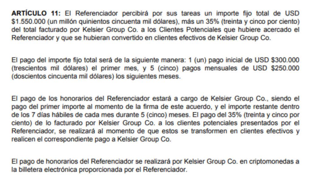 En aquel informe que Taiano tiene desde el 17 de noviembre del año pasado no sólo está el borrador de acuerdo que, según el periodista Mariano Vidal, Milei y Davis efectivamente firmaron. Hay bastante más que eso. Para empezar, está la famosa oferta de acuerdo por USD 1.550.000 más un 35% del total facturado, fechada el 21 de noviembre de 2024 y realizada por Kelsier Group (firma de Hayden Davis) al grupo local de Novelli, Manuel Terrones Godoy y Sergio Morales (sin firmas), quien mientras intermediaba negocios entre Davis y Milei actuaba de manera oficial como asesor de la Cámara Nacional de Valores (CNV), que se supone que debe regular y controlar la la transparencia del mercado3. Los peritos tecnológicos destacaron las siguientes cláusulas del acuerdo, que es básicamente un contrato de lobby: