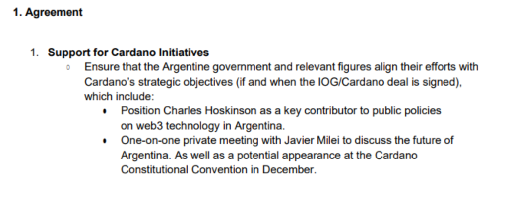 Pocos días después, el 27 de noviembre, se conforma un contrato consistente con esa oferta irrevocable, ahora en inglés, entre otro vehículo corporativo de Davis (la BVI Kelsier Holdings Limited) y el mismo grupo de empresarios locales (Novelli, Terrones Godoy y Morales) por montos similares a los ya mencionados y con el objeto de apoyar a la firma Cardano de Charles Hoskinson, incluyendo “reuniones privadas uno a uno con Javier Milei” y su “potencial aparición” en una convención de la empresa. Recordemos que, luego de que estalló el escándalo de la criptoestafa $LIBRA, Hoskinson denunció públicamente que, en el contexto del Tech Forum del 19 de octubre, Novelli y Terrones Godoy le habían pedido dinero para destrabar una reunión privada con Milei. Ya el New York Times había revelado ese tipo de pagos por reuniones con el Presidente en una nota de febrero de 2025.